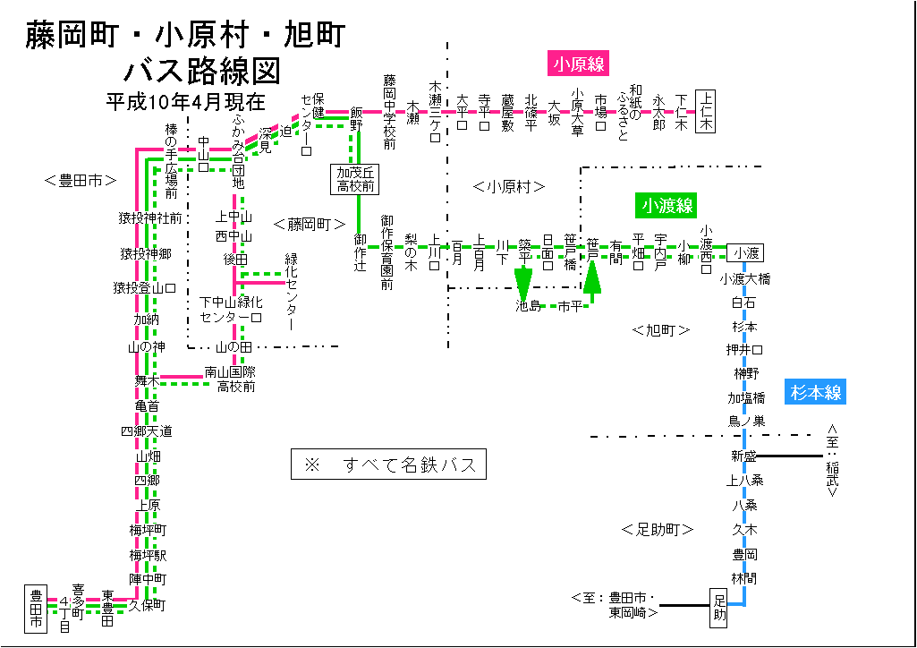 藤岡町・小原村・旭町内 バス路線図(平成11年9月30日まで)