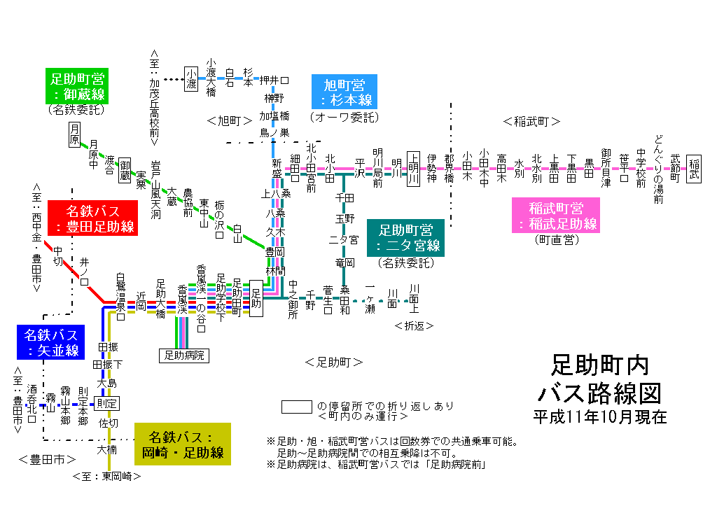 #99/10/01より、名鉄バス稲武線・足助以東が稲武町営バスに移管(稲武足助線)。