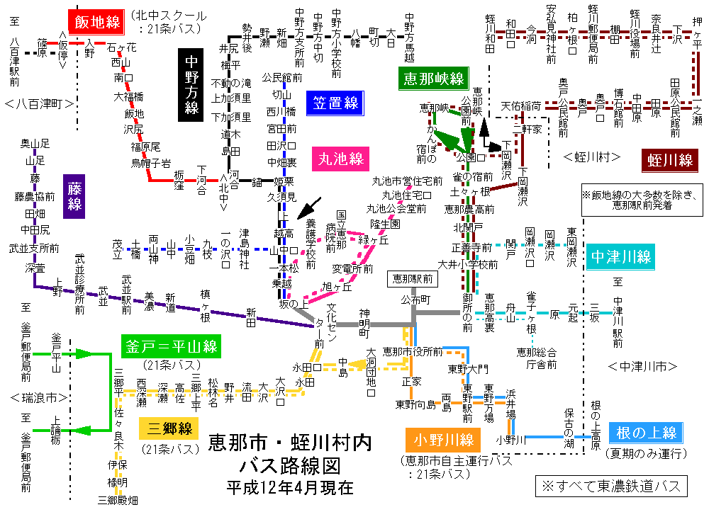 恵那市・蛭川村内 バス路線図(平成13年3月24日まで)