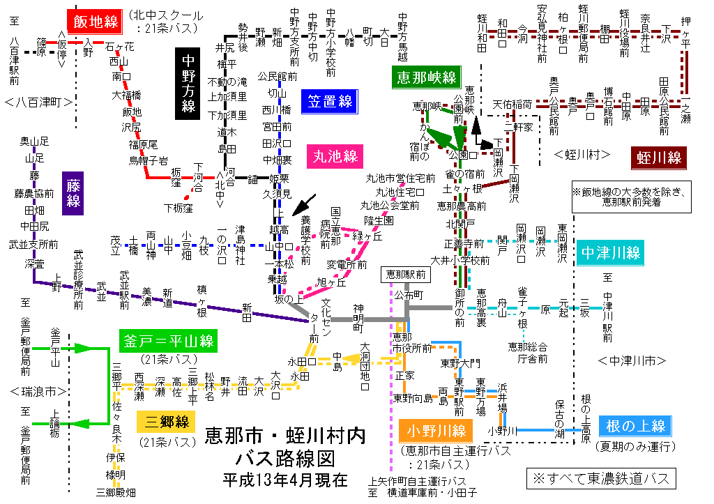 恵那市・蛭川村内 バス路線図(平成13年8月23日まで)