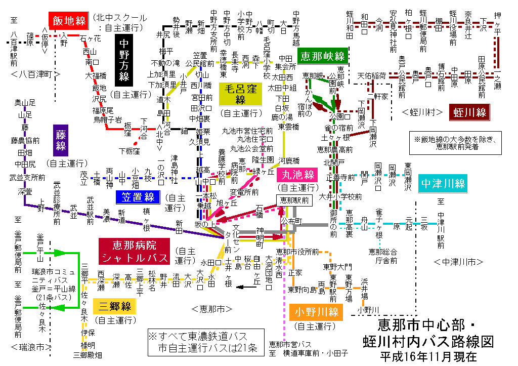 恵那市中心部・蛭川村内 バス路線図(平成17年2月12日まで)