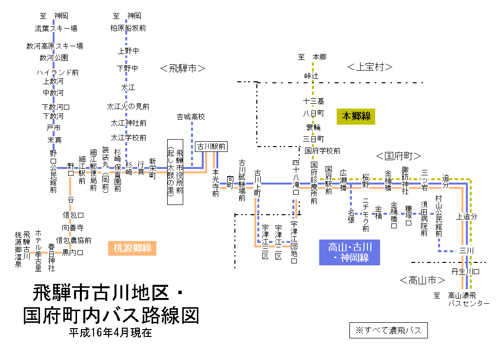 飛騨市古川地区・国府町内 バス路線図(平成16年11月25日まで)