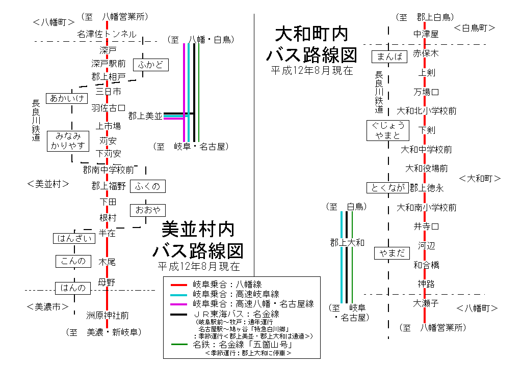 ※名鉄バス・名金線「五箇山号」(名鉄バスセンター〜郡上大和〜金沢駅前)は、00年は09/30限りで運行を打ち切り、01年度より運行休止となりました。