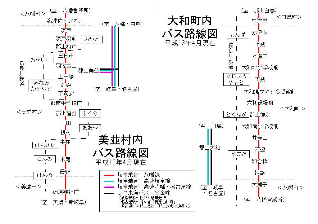 #01/04/01より、岐阜乗合・八幡線「大和中学校前」バス停が「大和温泉やすらぎ館前」に名称変更。