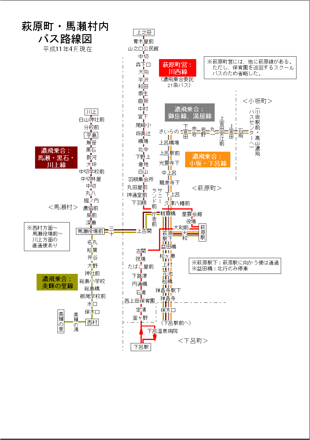 萩原町・馬瀬村内 バス路線図(平成14年3月31日まで)
