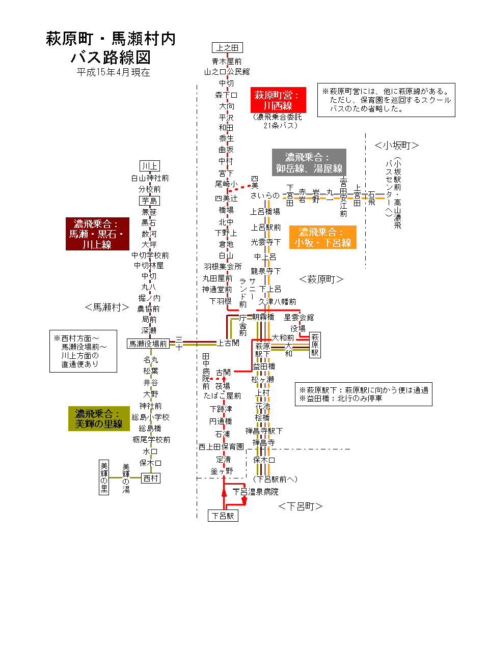 萩原町・馬瀬村内 バス路線図(平成16年2月29日まで)