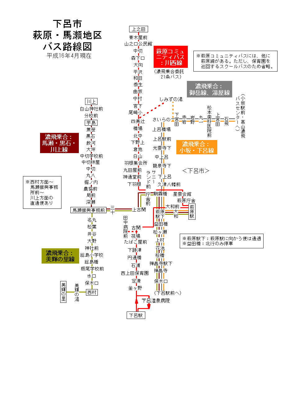 下呂市萩原地区・馬瀬地区 バス路線図(平成16年10月17日まで)