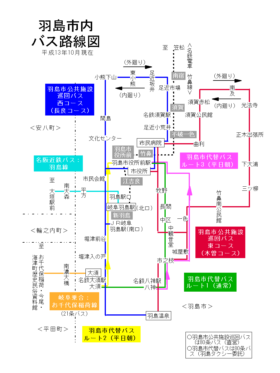 #01/10/01より、名鉄竹鼻線の江吉良〜大須間が廃止され、代替バスが運行開始(80条、羽島タクシー委託)。