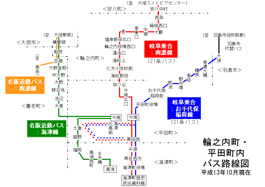 #01/10/01より、羽島市内の名鉄竹鼻線・江吉良〜大須間が廃止され、代替バスが運行開始(80条、羽島タクシー委託)。輪之内町・平田町内は変更なし。