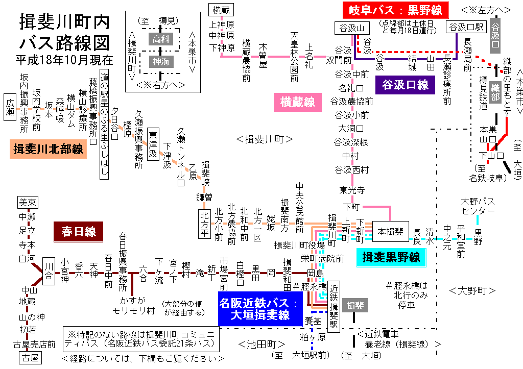 ※大垣揖斐線:「大垣駅前〜近鉄揖斐駅〜本揖斐〜北方平」と「近鉄揖斐駅〜本揖斐〜北方平〜東津汲」の2系統に分かれています。