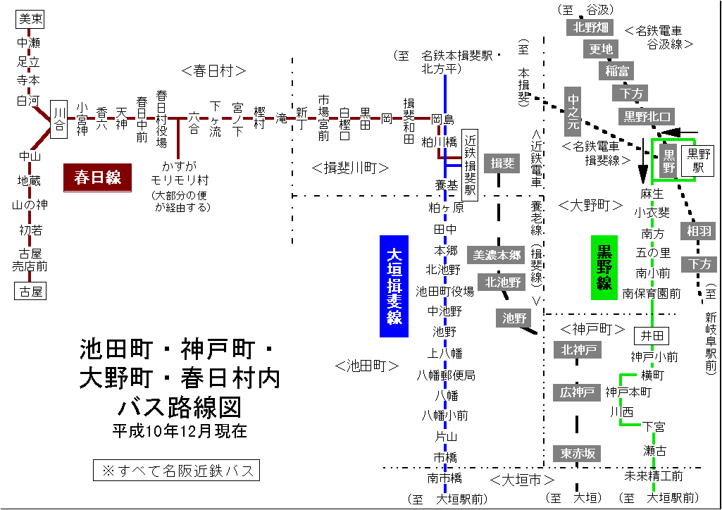 池田町・神戸町・大野町・春日村内 バス路線図(平成13年9月30日まで)