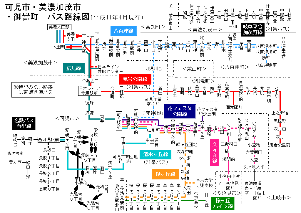可児市・美濃加茂市・御嵩町内 バス路線図(平成11年9月まで)
