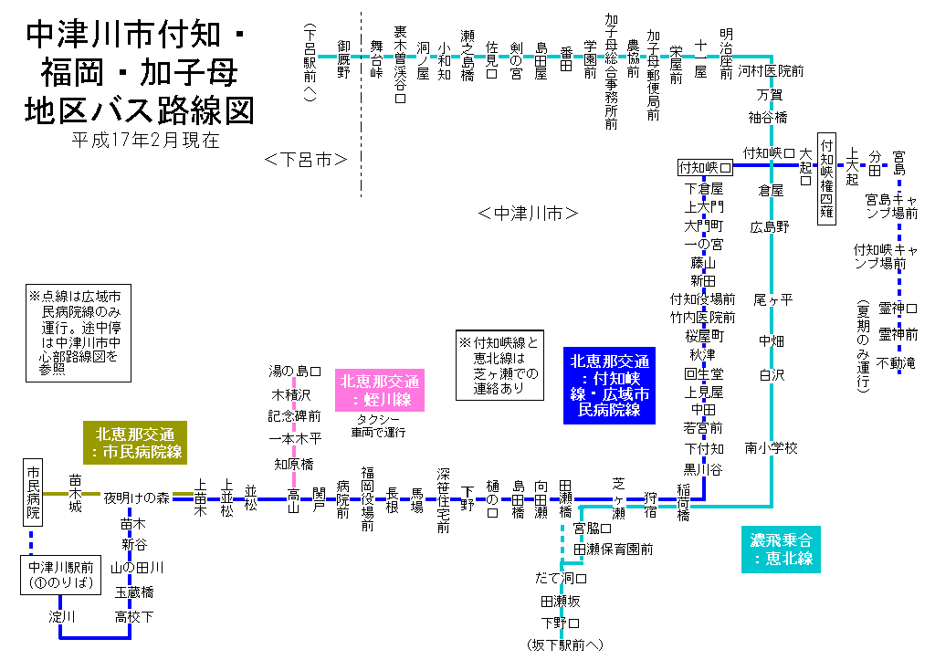 中津川市福岡・付知・加子母地区 バス路線図(平成17年4月22日まで)