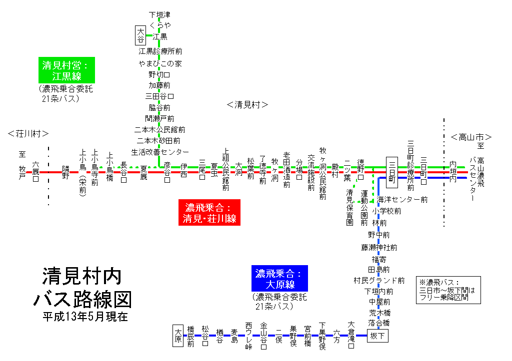 #01/05/01より、清見村営バス大原(おっぱら)線<80条直営>が、濃飛乗合委託<21条>に移行。大原線・江黒線で停留所増設。