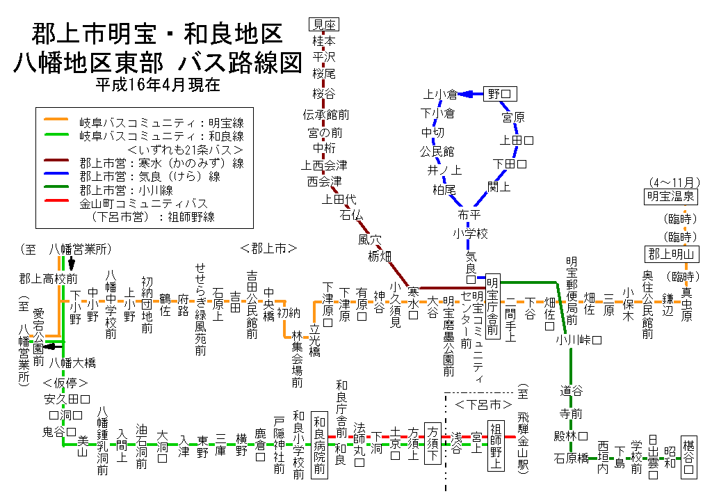#04/04/01より、岐阜バス「明宝役場前」を「明宝庁舎前」に、「明宝村民センター前」を「明宝コミュニティセンター前 」に改称。