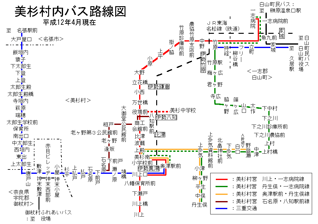 #00/04/01より、奈良県御杖村内の奈良交通がすべて御杖村営「御杖村ふれあいバス」に移管。小屋〜杉平間は廃止。