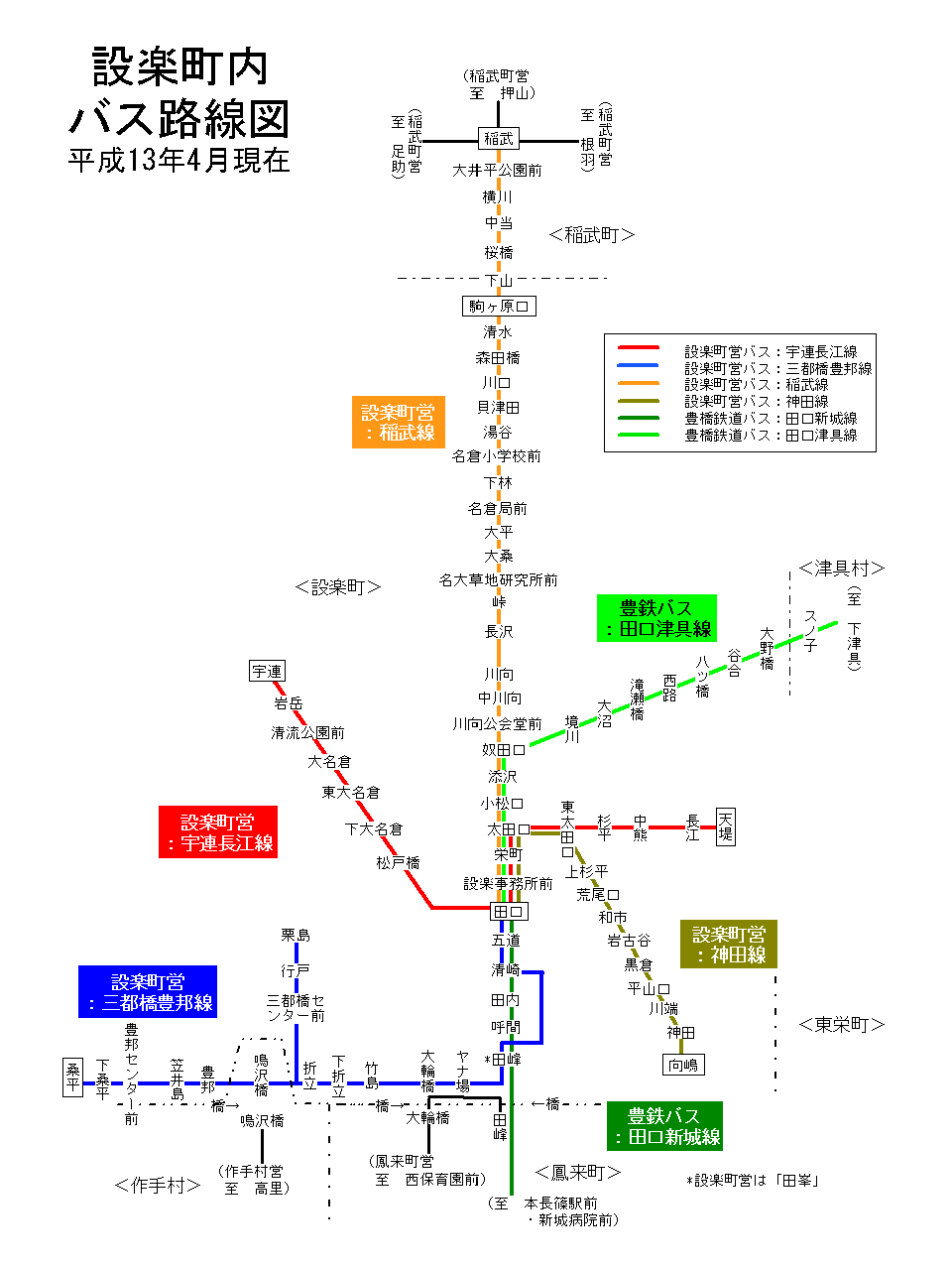 #01/03/31限りで、豊鉄バス田口本郷線が廃止。設楽町内(田口〜神田<かだ>〜向嶋)は町営バス神田線に移管。