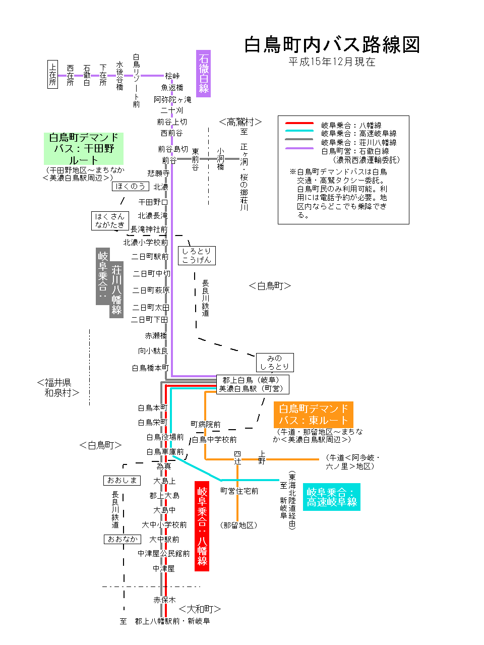 #03/12/10より、白鳥町営バス阿多岐線・六ノ里線・那留線・干田野線を廃止し、白鳥町デマンドバスに移行。