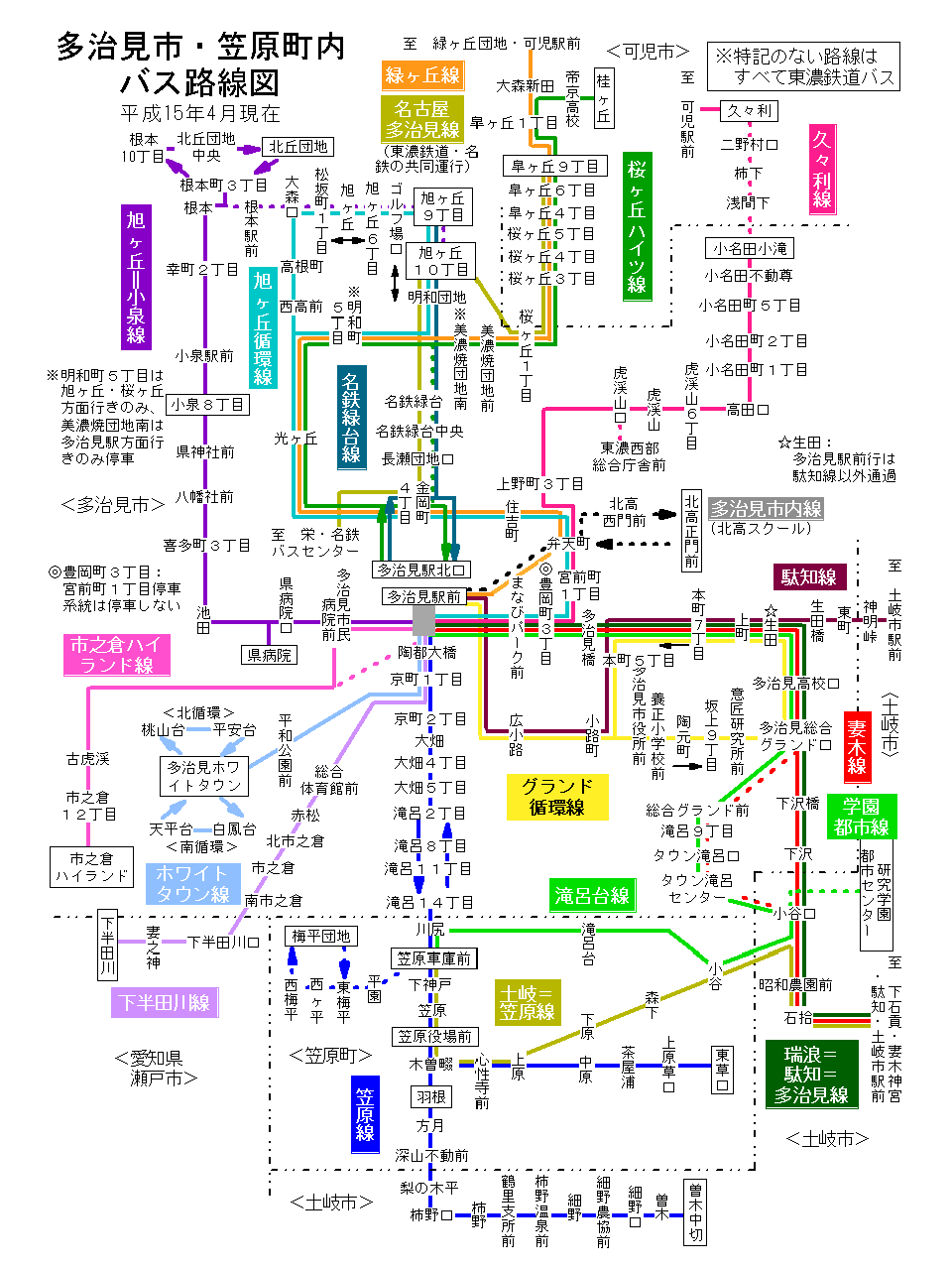 多治見市・笠原町内 バス路線図(平成15年6月30日以前)