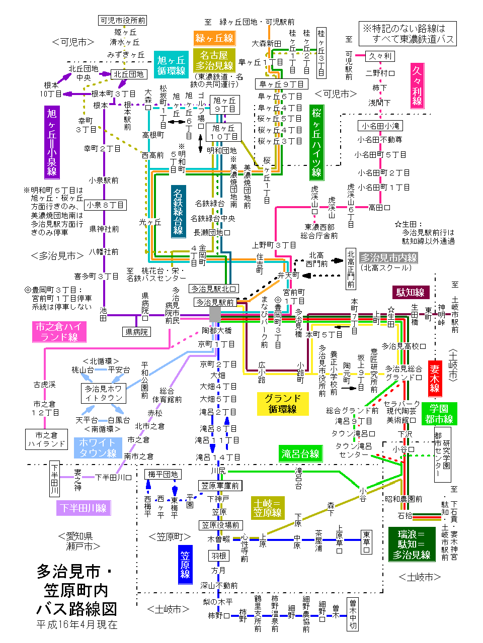#04/04/01より、東濃鉄道「多治見駅北口」バス停が道路上バス停からロータリーに移動。桜ヶ丘ハイツ線・名鉄緑台線が経路変更。
