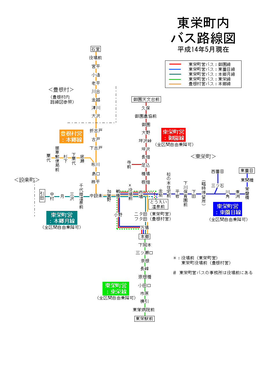 #02/04/19より、東栄町営バス各線が「とうえい温泉前」(市場・二タ田〜金紫間)に乗り入れ開始。東栄線も本郷〜戦橋〜とうえい温泉前間を延長。