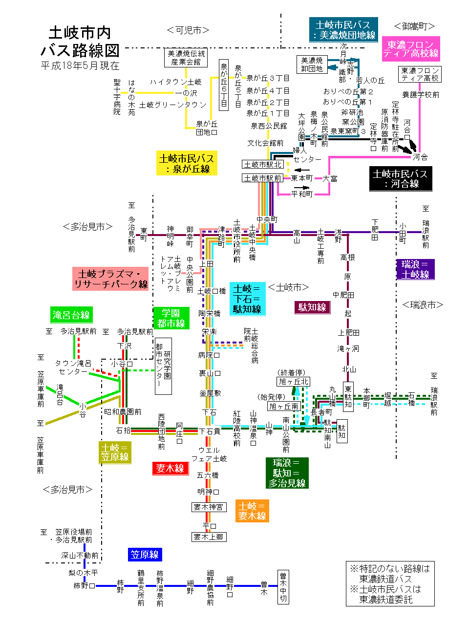 #06/04/27より、土岐市民バスどんぶり会館線(土休日運行)が駄知経由でバーデンパークSOGIまで延長し、どんぶり会館 バーデンパーク線となる。また、バーデンパーク線(平日運行、下石・鶴里経由)が運行開始。