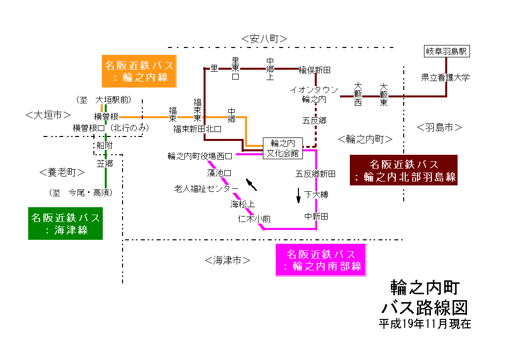 従来の輪之内羽島線(輪之内文化会館〜五反郷〜イオンタウン輪之内〜岐阜羽島駅)も輪之内北部羽島線の1系統に組み込む。