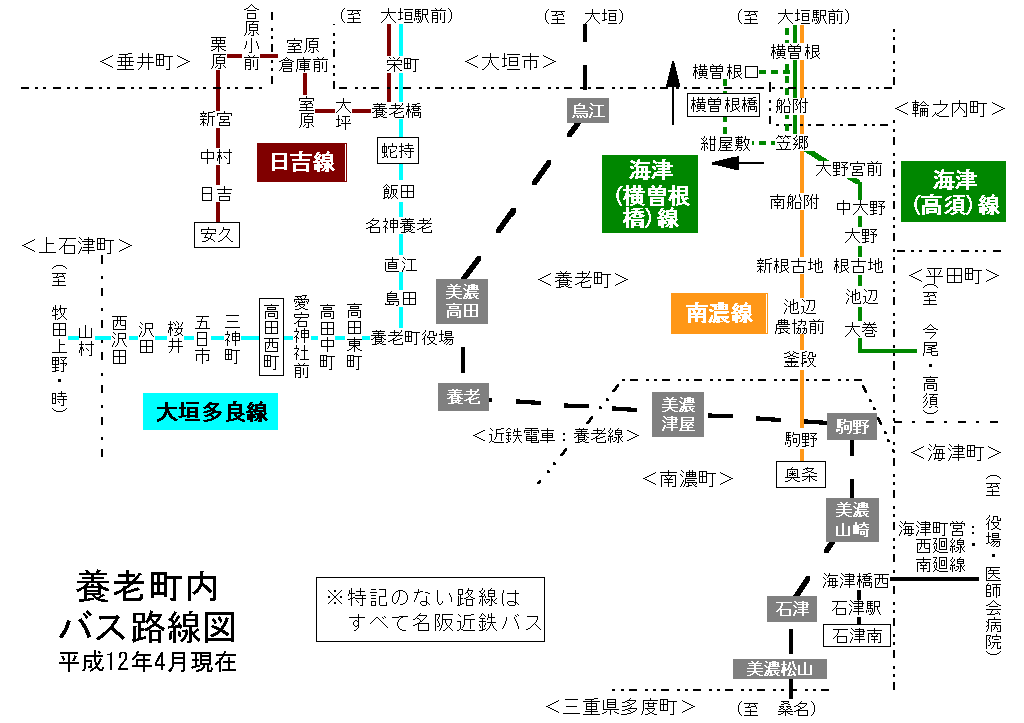 #養老公園線(養老駅〜公園口〜大悲閣前〜養老公園、4月1日〜5月31日および10月1日〜11月30日の毎日運行)は平成10年限りで休止。