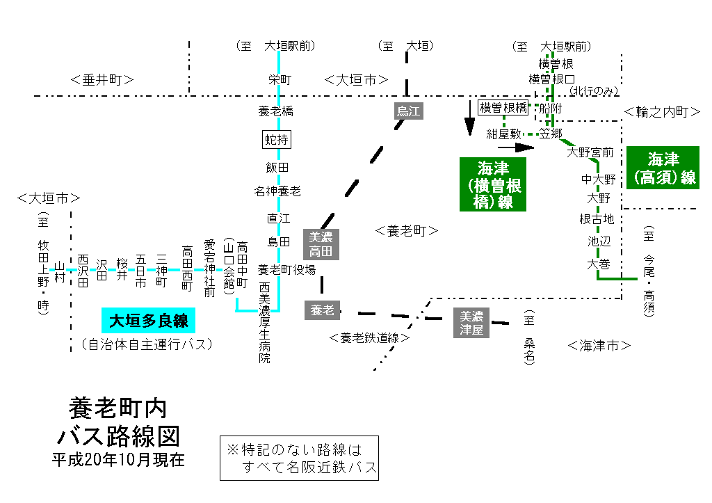 #08/10/01より、名阪近鉄バス大垣多良線が大垣市・養老町自主運行バスとなる。経路変更なし。